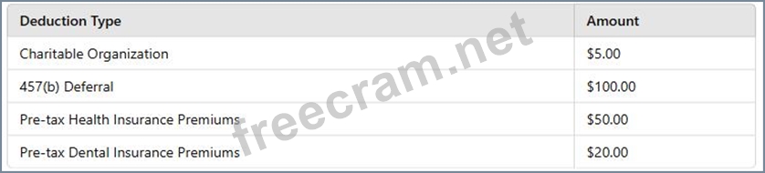 Comprehensive and Detailed Explanation: Section 125 Cafeteria Plan deductions include only pre-tax health and dental insurance contributions. Eligible Pre-Tax Deductions: Health Insurance Premiums: $50.00 Dental Insurance Premiums: $20.00 Total Section 125 Deductions: $70.00 Non-Eligible Deductions: Charitable Contributions ($5.00) → Not pre-tax. 457(b) Deferral ($100.00) → Retirement savings, not a Section 125 deduction. Thus, the correct answer is A. $70.00. Reference: IRS - Section 125 Cafeteria Plan Guidelines Payroll.org - Employee Benefit Deduction Compliance