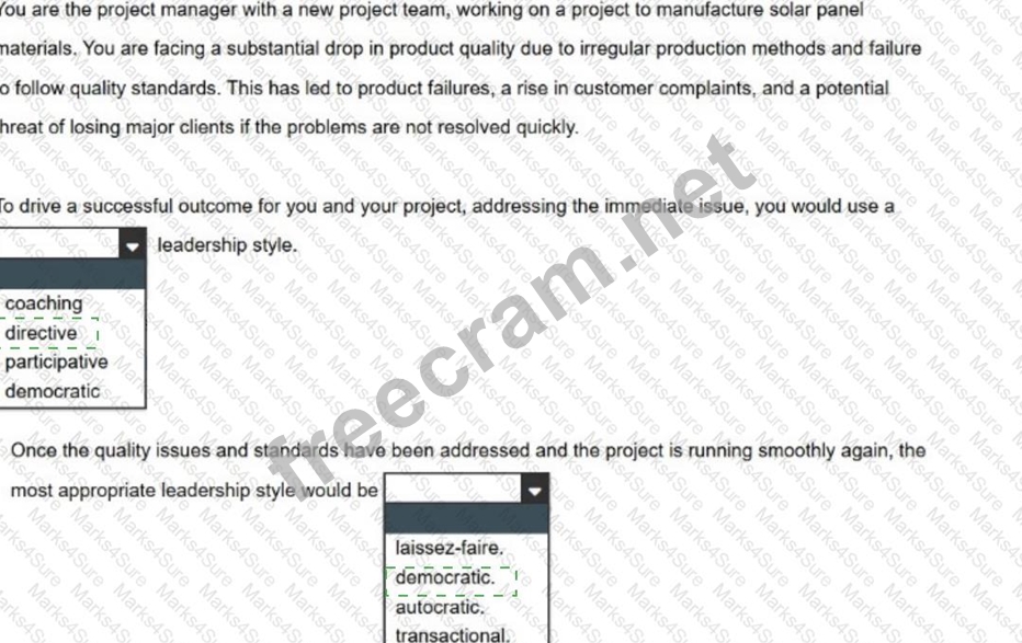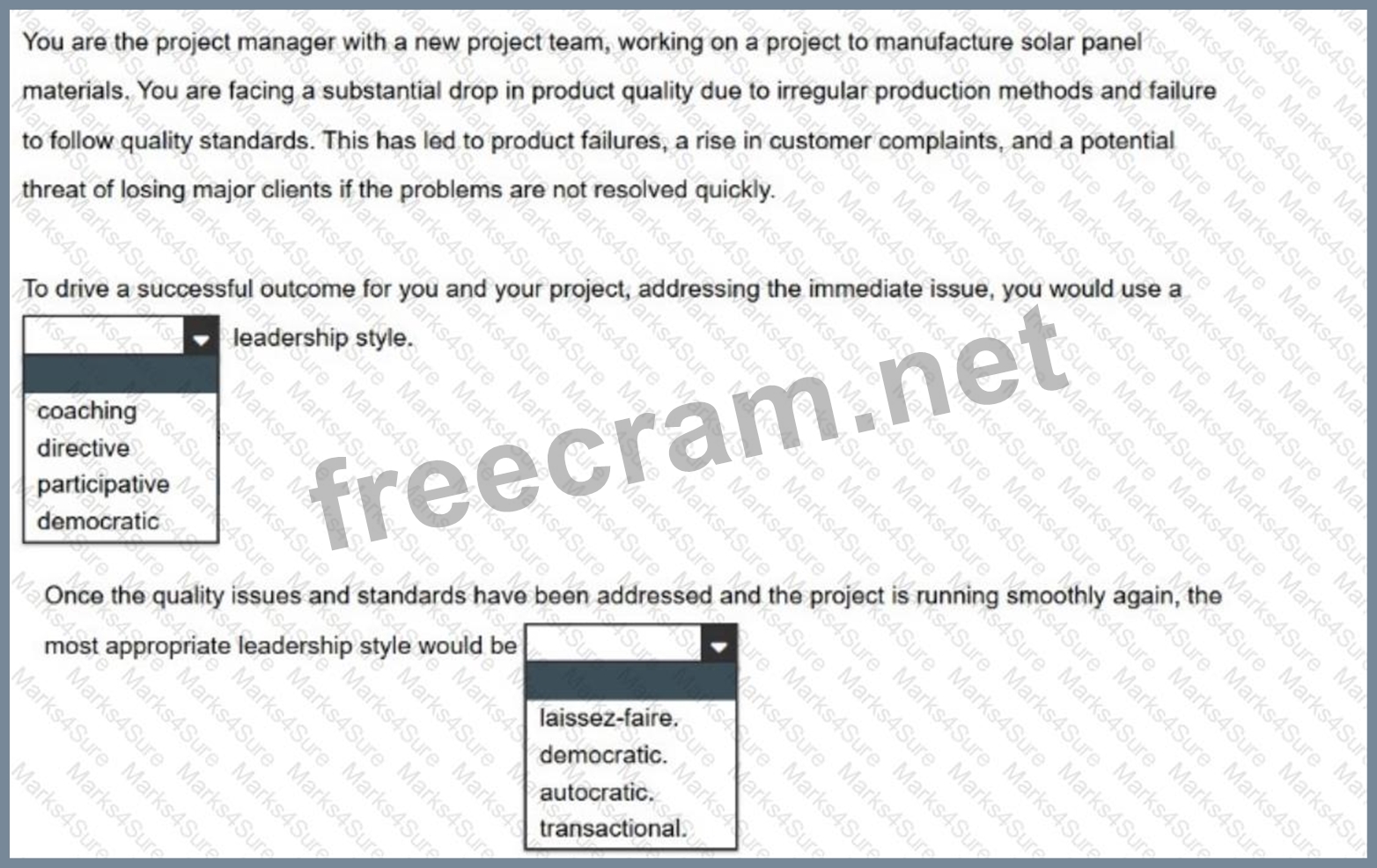 Explanation: Directive Democratic Detailed Explanation: * Directive Leadership:In crises requiring urgent attention, a directive approach ensures quick decision- making and compliance. It allows the leader to control processes to restore stability effectively.
