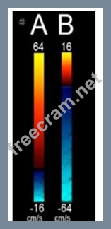 The color bar on a Doppler ultrasound display indicates the range of velocities that the system can detect and display. In color bar A, the scale is set to a higher maximum velocity (64 cm/s), while in color bar B, the scale is set to a lower maximum velocity (16 cm/s). Adjusting the scale (or velocity range) changes the upper and lower limits of the velocities displayed, which affects the sensitivity of the Doppler system to detect flow velocities. Lowering the scale allows for better visualization of lower velocities, but it may also increase the likelihood of aliasing for higher velocities. Reference: American Registry for Diagnostic Medical Sonography (ARDMS). Sonography Principles and Instrumentation (SPI) Examination Review Guide.