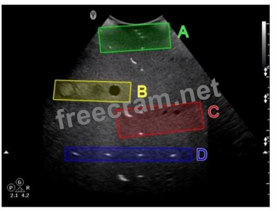 In the tissue-mimicking phantom image, Option D (blue box) is used to evaluate transverse distance measurement accuracy. Phantoms are used to simulate human tissue and provide a standardized way to test the accuracy and precision of ultrasound machines. Transverse distance measurement accuracy is assessed by measuring known distances between targets in the phantom. The blue box (Option D) typically contains targets positioned to specifically test the accuracy of transverse measurements, ensuring that the ultrasound system provides reliable and precise distance readings. Reference: ARDMS Sonography Principles and Instrumentation (SPI) Exam Study Guide "Quality Assurance for Ultrasound Imaging Systems" by AAPM (American Association of Physicists in Medicine)