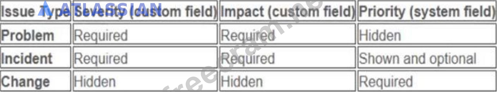 A team requests updates to the behavior of some fields in the project. The project uses three issue types: Problem, Incident, and Change.