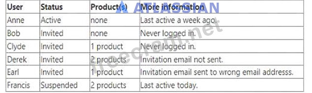 Explanation Users who have access to at least one product are considered billable. In this case, Clyde, Derek, Earl, Francis, and Anne are billable users. Bob is not billable because he has not accepted the invitation to join the organization. References = [Manage users and user tiers] and [Control how users get access to products]