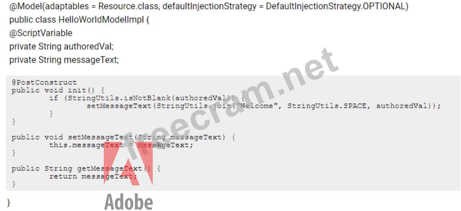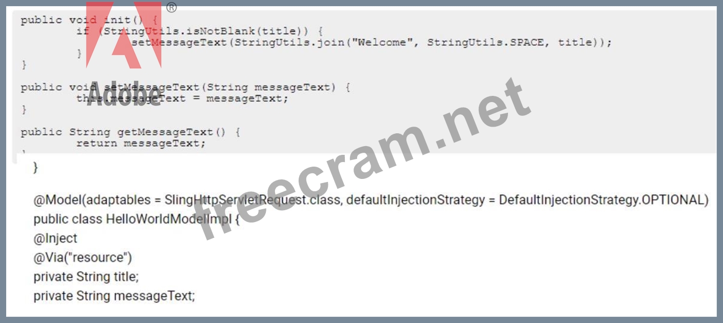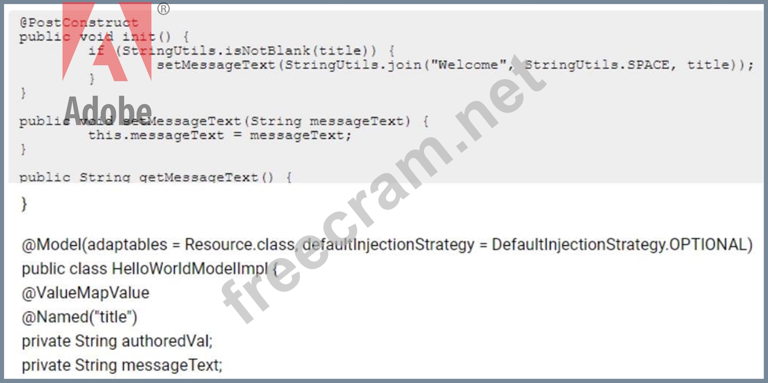 A custom component has one dialog field: The developer needs to implement a Sling Model to perform a business logic on the authored value. The developer writes the following HTL snippet. Which two implementations will support this HTL snippet? (Choose two.)