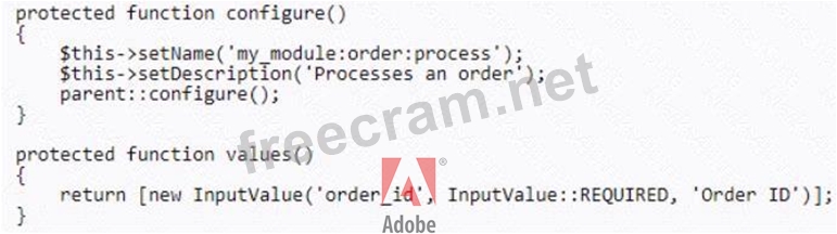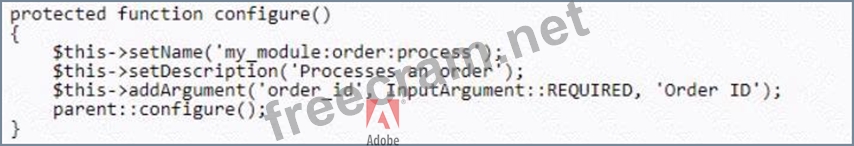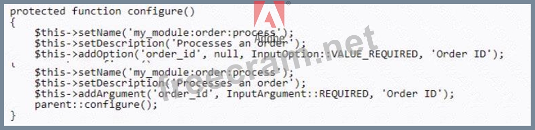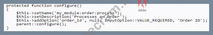 An Adobe Commerce developer has created a process that exports a given order to some external accounting system. Launching this process using the Magento CLI with the command php bin/magento my_module:order: process --order_id=<order_id> is required. Example: php bin/magento my_module:order:process --order_id=1245. What is the correct way to configure the command?