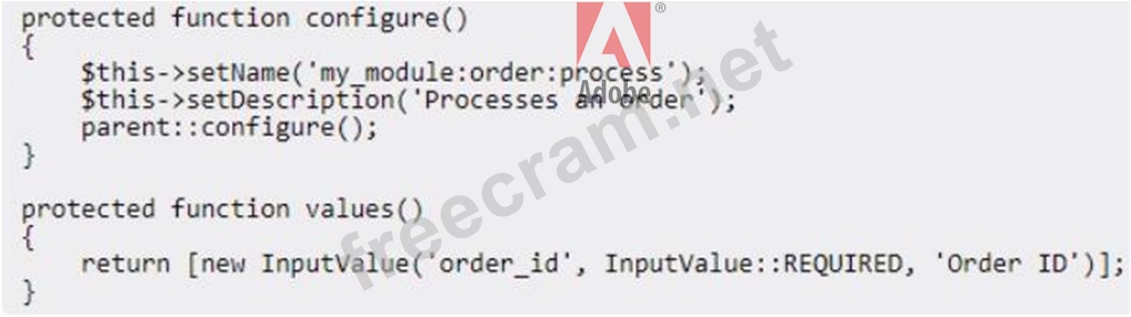 An Adobe Commerce developer has created a process that exports a given order to some external accounting system. Launching this process using the Magento CLI with the command php bin/magento my_module: order: process --order_id=<order_id> is required. Example: php bin/magento my_module:order:process --order_id=1245. What is the correct way to configure the command?