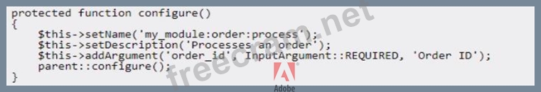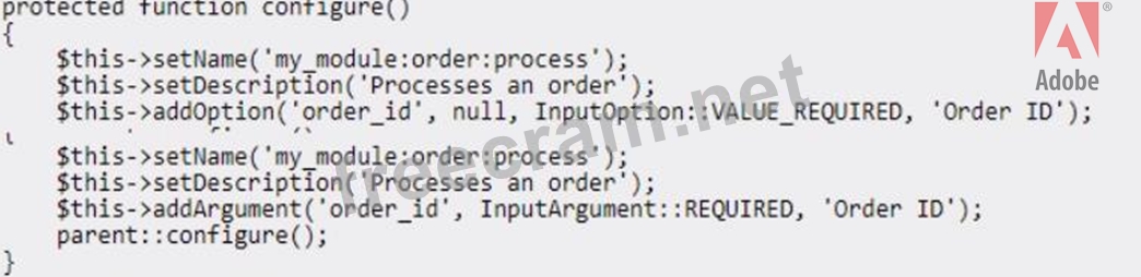 To properly configure a Magento CLI command that includes a required argument, such as --order_id, which is mandatory for processing an order, the best approach is to use the addArgument method within the configure function. This method defines required arguments for the command, ensuring the user provides the necessary data. Option D is correct for the following reasons: * Using addArgument for Required Inputs:The addArgument method is used here to declare order_id as a required argument. This is more appropriate than addOption when the parameter is essential for command execution and should not be omitted. By specifying InputArgument::REQUIRED, the command ensures that the order_id must be provided by the user. * Explanation: addArgument is ideal for required data that the command cannot function without, while addOption is typically used for optional parameters. order_id is essential to identify which order to process, making addArgument the suitable choice here. * References: According to Magento's official developer documentation, addArgument is used for required command-line arguments, and this is standard practice for defining necessary inputs in CLI commands. * Properly Configured Command Name and Description:The setName and setDescription methods are correctly used in this option to specify the command's name and its purpose. This helps in making the command self-descriptive, improving usability and readability for other developers or administrators using the CLI. Options A, B, and C are incorrect because they either: * Use addOption instead of addArgument, which is less suitable for mandatory parameters (Option B). * Define the same parameter redundantly (Option C). * Use other non-standard configurations that do not align with Magento's best practices for required CLI parameters (Option A).