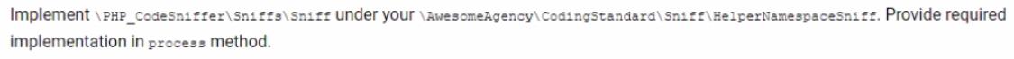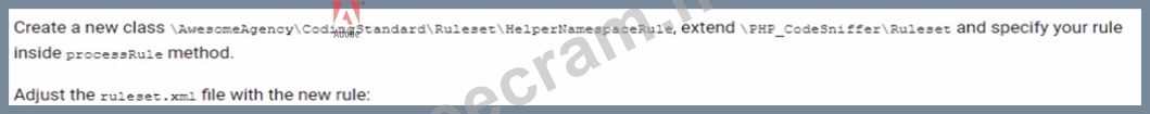 An Architect agrees to improve company coding standards and discourage using Helper classes in the code by introducing a new check with PHPCS. The Architect creates the following: * A new composer package under the AwesomeAgency\CodingStandard\ namespace * The ruleset. xml file extending the Magento 2 Coding Standard What should the Architect do to implement the new code rule? A) B) C)