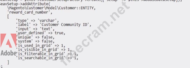 A merchant is utilizing an out-of-the-box Adobe Commerce application and asks to add a new reward card functionality for customers. During the code review, the Adobe Commerce Architect notices the reward_card_number attribute setup created for this functionality is causing the customer attribute to be unavailable in the My account/My rewards page template. What should be added to set the customer attribute correctly?
