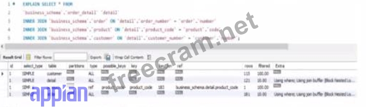 Option E (The worst join is the one between the table order_detail and customer): Similarly, there's no basis to designate this as the worst join. The row counts (155 and 121) and filtering (100%) are consistent with other joins, indicating a general indexing issue rather than a specific problematic join.