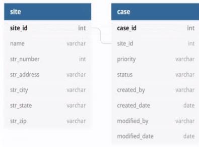 You decide to create a view as the source of your entity-backed record, which joins the separate case/site tables (as depicted in the following Image).