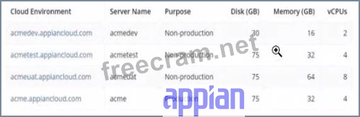 acmedev.appiancloud.com (acmedev): Non-production, Disk: 30 GB, Memory: 16 GB, vCPUs: 2 acmetest.appiancloud.com (acmetest): Non-production, Disk: 75 GB, Memory: 32 GB, vCPUs: 4 acmeuat.appiancloud.com (acmeuat): Non-production, Disk: 75 GB, Memory: 64 GB, vCPUs: 8 acme.appiancloud.com (acme): Production, Disk: 75 GB, Memory: 32 GB, vCPUs: 4 Load testing assesses an application's performance under increased user load to ensure scalability and stability. Appian's Performance Testing Guidelines emphasize using an environment that mirrors Production as closely as possible to obtain accurate results, while avoiding direct impact on live systems.