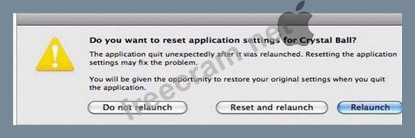 Review the screenshot of an alert dialog, and then answer the question below. You are using a forecasting application, Crystal Ball, on a Mac OS X v10.6 computer, when you see the alert dialog above. What will happen if you click Reset and relaunch?