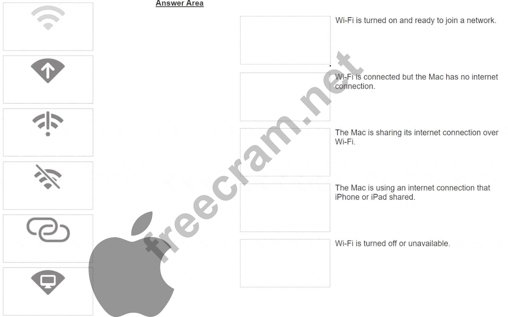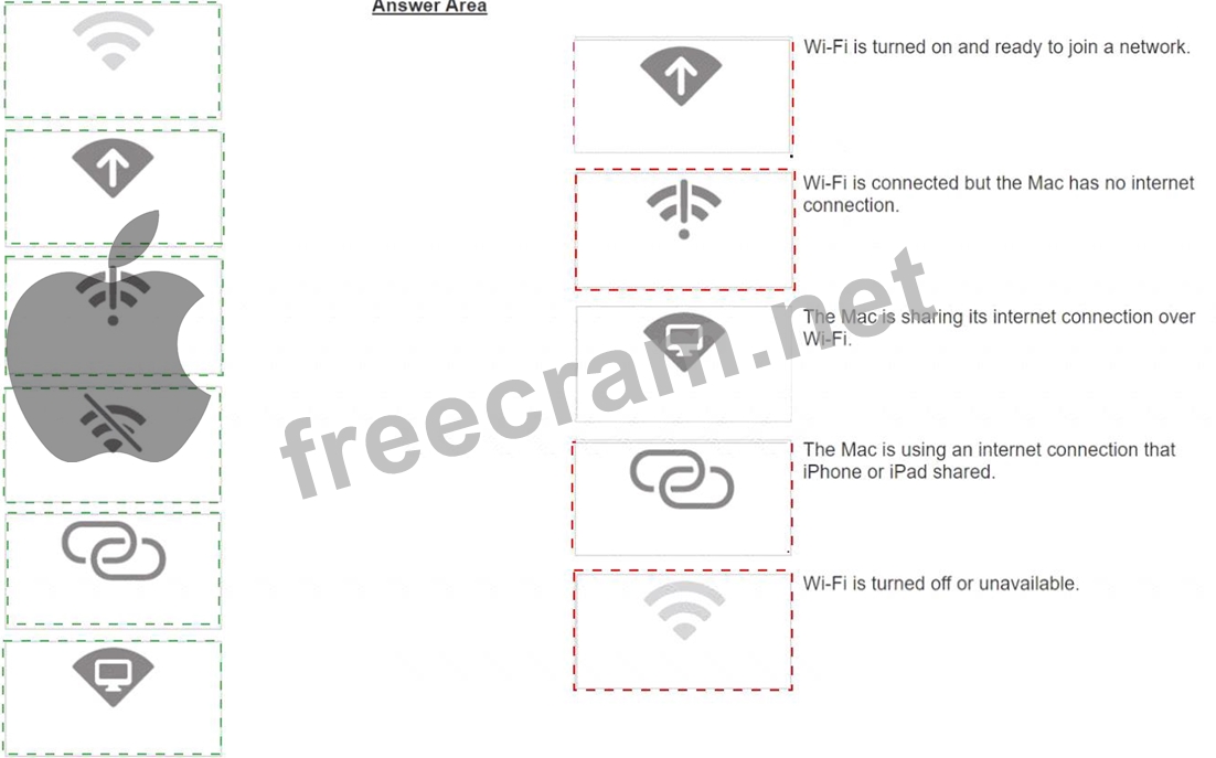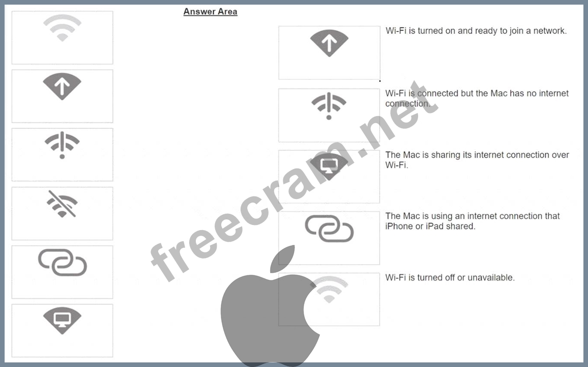 Match the Wi-Fi menu bar icons on the left to the descriptions on the right by dragging the responses to the correct target areas. Responses may be used once, more than once, or not at all.
