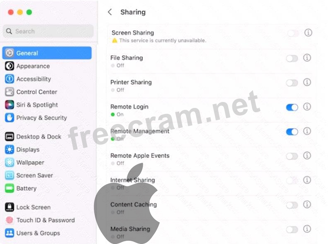 According to the image you sent, the screen sharing service is disabled because the remote management service is turned on. You can't have both screen sharing and remote management on at the same time. Remote management allows you to perform more advanced tasks on another Mac, such as installing and configuring apps, helping remote users, and creating detailed reports. Screen sharing allows you to view and control another Mac's screen. To enable screen sharing, you need to turn off remote management first. You can do this by going to System Settings > General > Sharing and deselecting Remote Management. Then you can check the box next to Screen Sharing to turn it on. Alternatively, you can use Apple Remote Desktop, a commercial app that combines the features of screen sharing and remote management, and works with both Intel-based and Apple silicon Macs. References: Turn Mac screen sharing on or off - Apple Support, Mac screen sharing won't work? Disable it! Then turn it back on, Revive or restore a Mac with Apple silicon using Apple Configurator - Apple Support