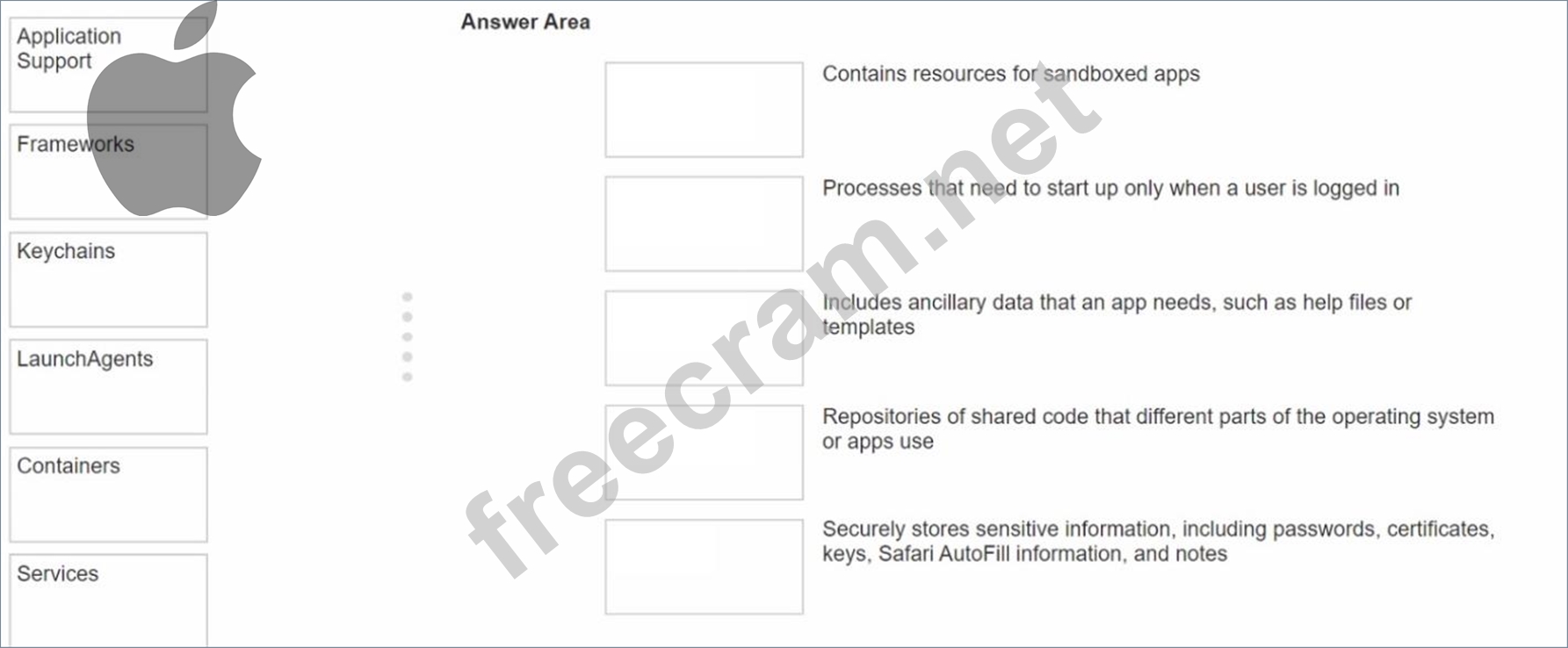 Match the macOS library resources listed on the left to the descriptions on the right by dragging responses to the correct target areas. Responses may be used once, more than once, or not at all.