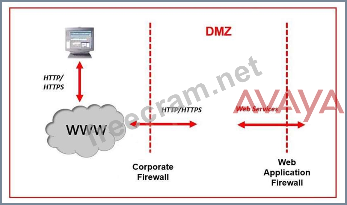 Refer to the exhibit. A customer is using Contact Center Multimedia (CCMM) to provide Web Services or integrating Web Chat with their Contact Center. They have created a DMZ to protect the Avaya AuraContact Center (AACC) server and the Corporate Web Server by deploying a Corporate Firewall and a Web Application Firewall. What is the recommended placement of the AACC Voice and Multimedia server in relation to the Corporate Web Server where the customerfacing Web Chat Application resides?