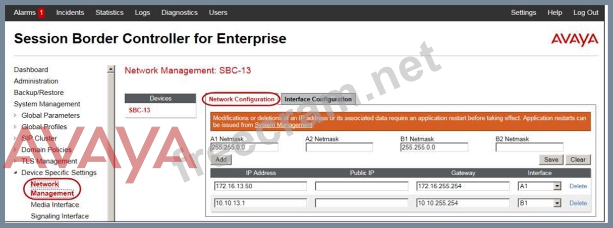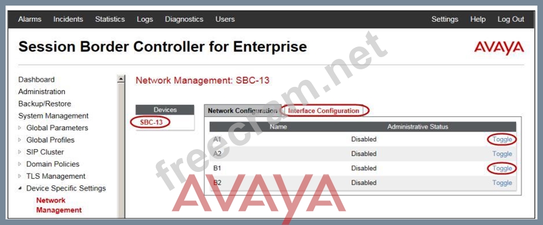 Explanation The interface might need to be enabled. 2. Click on the Interface Configuration tab. 3. Click the Toggle link for both the A1 and the B1 interfaces. The Administrative Status for both A1 and B1 changes to Enabled References: Avaya Aura Session Border Controller Enterprise Implementation and Maintenance (2012), page 204