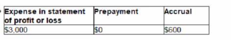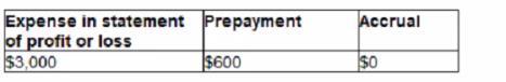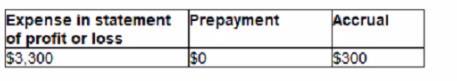 On 1 July 20X7, VWX enters into a 12-month lease for personal computers paying a non-refundable deposit of $600. Lease payments of $500 are paid monthly in arrears. VWX chooses to recognise the assets in the lease as short life and low value Which of the following gives the correct value for the expense in the statement of profit or loss and corresponding prepayment and accrual in VWX's statement of financial position for the year ended 31 December 20X7?