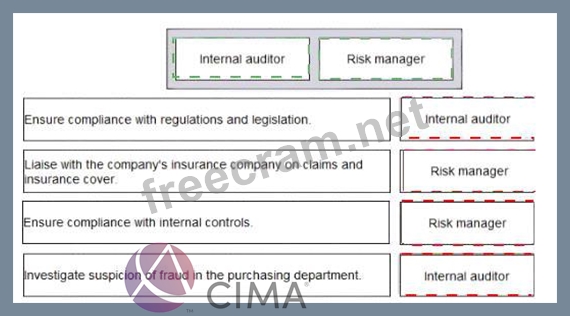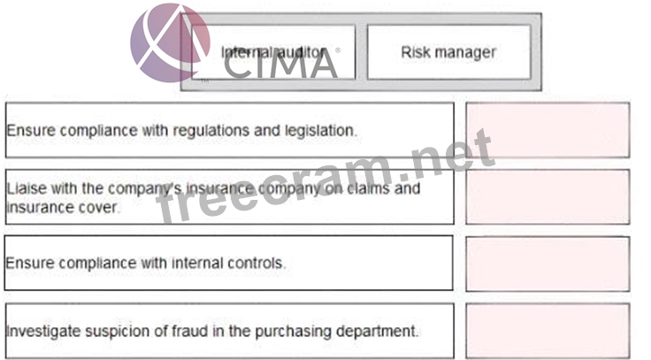 Assuming a company has both internal auditors and risk managers, indicate which of these would perform the duties listed below: