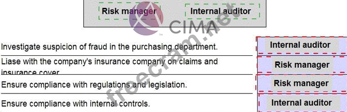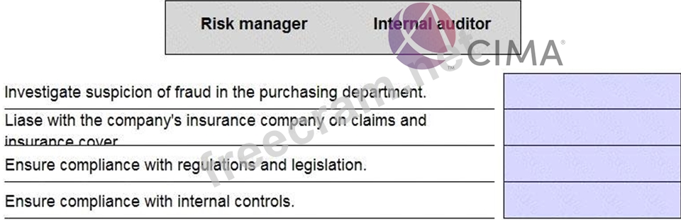 The list below has duties performed by risk managers and internal auditors. Show who would carry out the duties assuming the company has both risk managers and internal auditors.