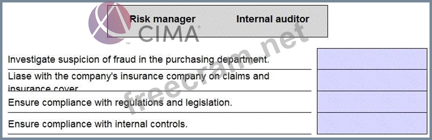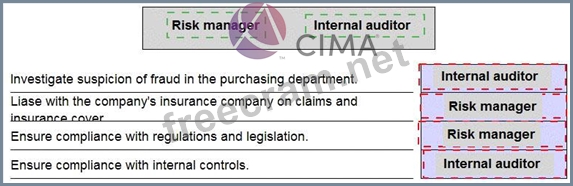 The list below has duties performed by risk managers and internal auditors. Show who would carry out the duties assuming the company has both risk managers and internal auditors.