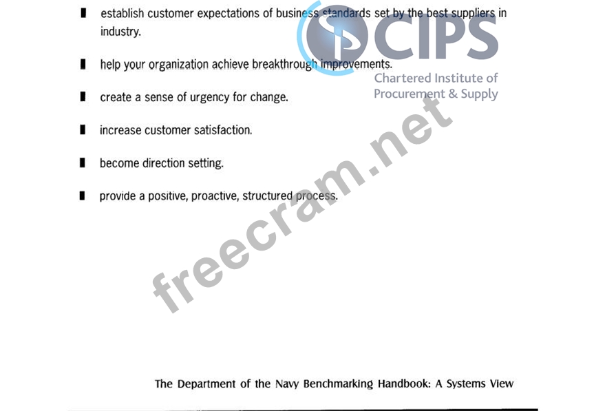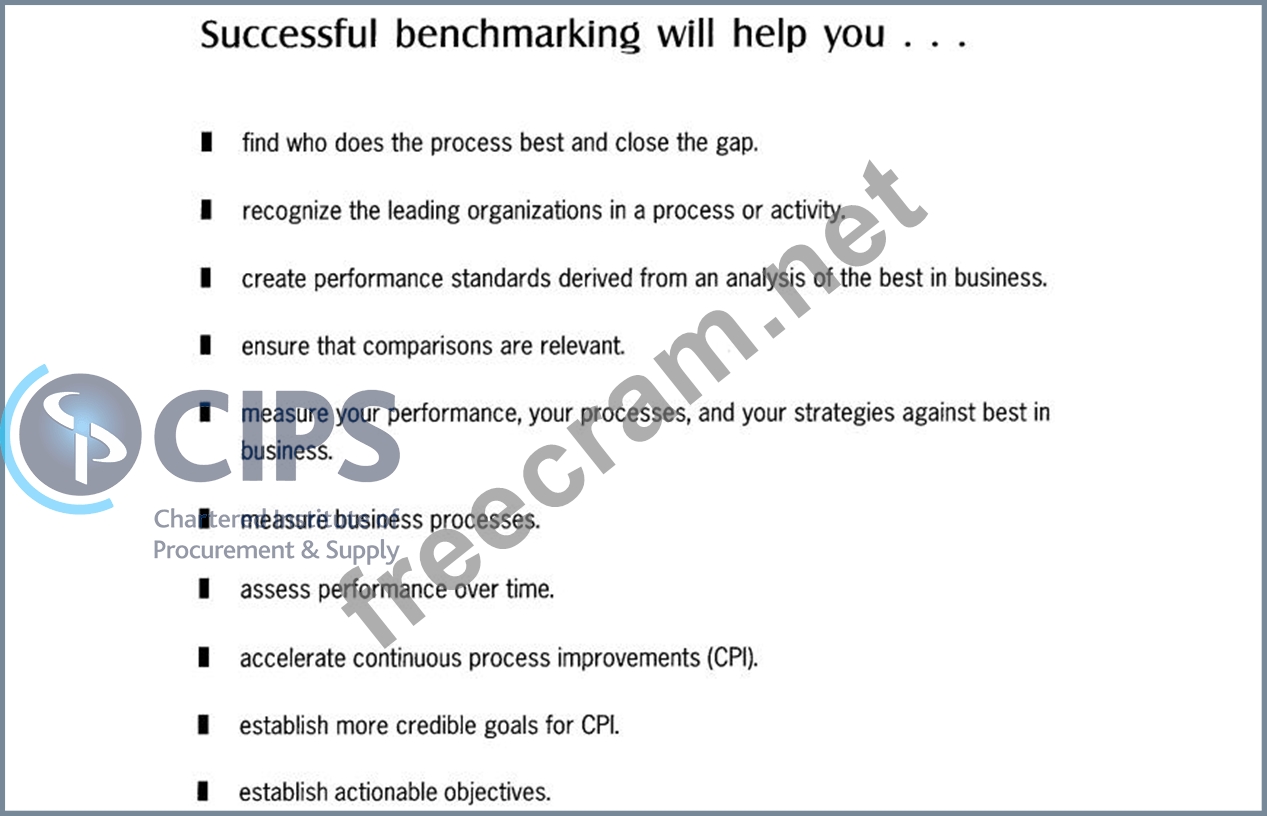 Benchmarking is 'the pursuit by organisations of enhanced performance by learning from the suc-cessful practices of others. Benchmarking is a continuous activity; key internal processes are adjusted, performance is monitored, new comparisons are made with the current best performers and further changes are explored. Where information about these key processes is obtained through a co-operative partnership with specific organisations (rather than via a third party such as an independently-maintained database), there is an expectation of mutual benefit over a period of time. Reference: - The Department of Navy Benchmarking Handbook: A system view - CIPS study guide page 49-51 LO 1, AC 1.3