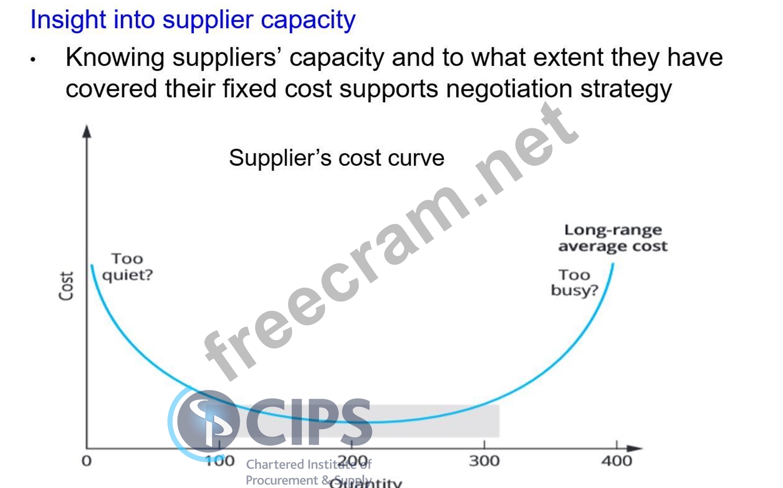 In some markets, suppliers experience peaks and troughs in demand and so buyers can increase their leverage through developing an understanding of how busy their vendor are at particular time during the year or business cycle and targetting atquieter period. Similarly, if a buyer can develop an understanding of supplier capacity and to what extent have they covered their fixed cost, they may be able to target suppliers when their average costs are likely to be lowest. Vendor's average costs will be higher at low and high capacity utilisation.
