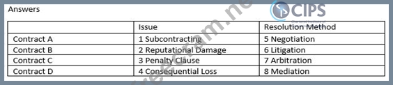 The correct answers are as follows: Arbitration - this is a binding resolution made by a third party. This answer could be litigation, but that option has been taken by box 6 and you can only use the answers once. Mediation would not be a binding resolution and negotiation doesn't involve a third party.