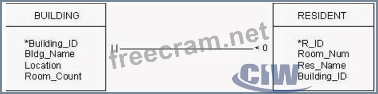 Consider the Information Engineering diagram shown in the exhibit. Building_ID, R_ID, Room_Count and Room_Num are integer numbers, whereas Bldg_Name and Res_Name are represented by variable-length strings with a maximum of 20 characters. Location can be up to 50 characters long, and no building has more than 600 rooms. Which SQL statement best implements the BUILDING relation shown in this diagram?