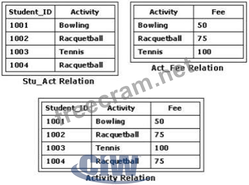 Consider the Stu_Act and Act_Fee tables shown in the exhibit. Which relational algebraic operation would yield the Activity Relation table in the exhibit?