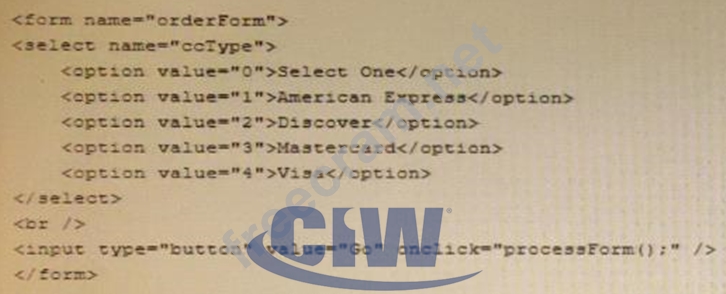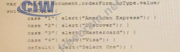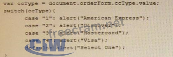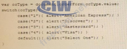 Ginger needs to write a script to display a pop-up alert box with the type of credit card the user selected Which of the following code blocks should she use?