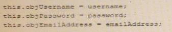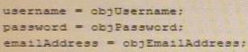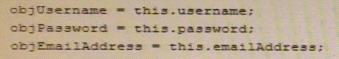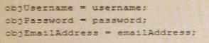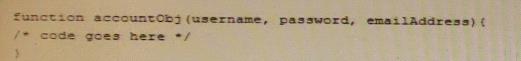 Kirken needs to write a script to construct custom objects that store user account information such as a username. password and e-mail address for a Web site. What should he add to the following code to set these properties? A) B) C) D)