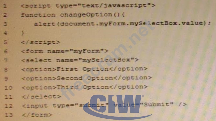 Charies wants to write code to execute the changeOption function after the user chooses an option in the select menu. What change to the code should he make?