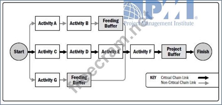 One buffer, placed at the end of the critical chain, as shown in Figure 6-19, is known as the project buffer and protects the target finish date from slippage along the critical chain. Additional buffers, known as feeding buffers, are placed at each point where a chain of dependent activities that are not on the critical chain feeds into the critical chain. Feeding buffers thus protect the critical chain from slippage along the feeding chains. The size of each buffer should account for the uncertainty in the duration of the chain of dependent activities leading up to that buffer. Once the buffer schedule activities are determined, the planned activities are scheduled to their latest possible planned start and finish dates. Consequently, instead of managing the total float of network paths, the critical chain method focuses on managing the remaining buffer durations against the remaining durations of chains of activities.