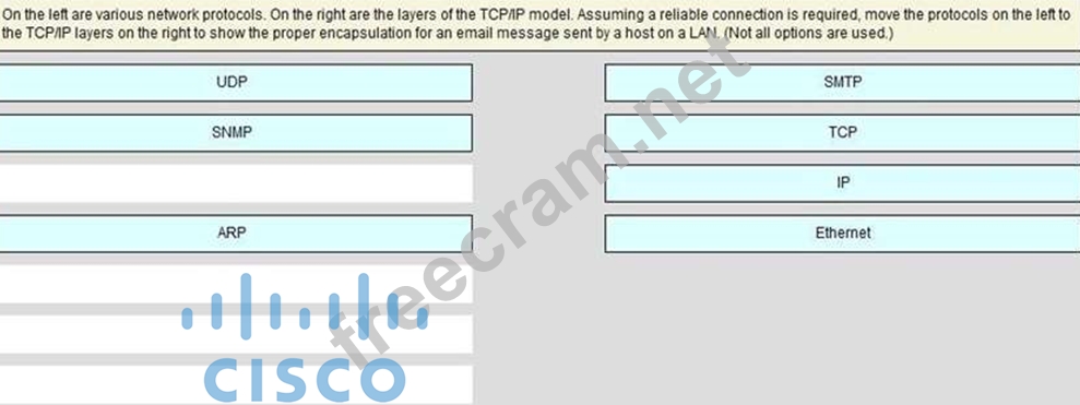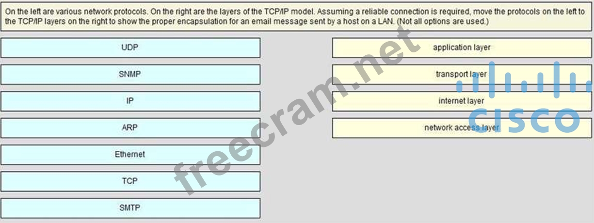 DRAG DROP On the left are various network protocols. On the right are the layers of the TCP/IP model. Assuming a reliable connection is required, move the protocols on the left to the TCP/IP layers on the right to show the proper encapsulation for an email message sent by a host on a LAN. (Not all options are used.) Select and Place: