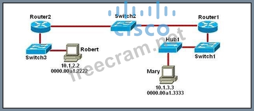 Refer to the exhibit. As packets travel from Mary to Robert, which three devices will use the destination MAC address of the packet to determine a forwarding path? (Choose three.)