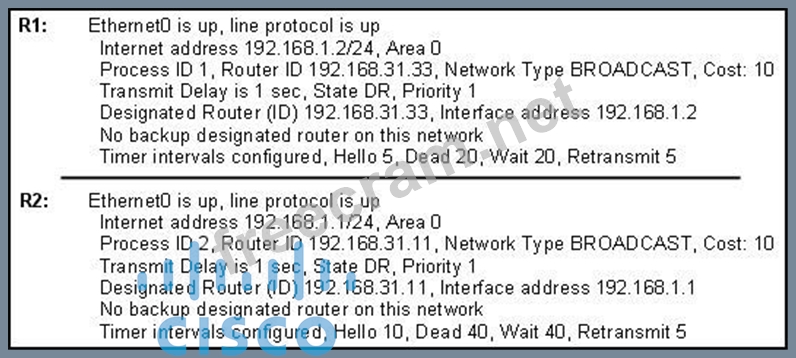 The graphic shows the output of the show ip ospf interface e0 command for routers R1 and R2. Based on the information in the graphic, what is the cause of this problem?
