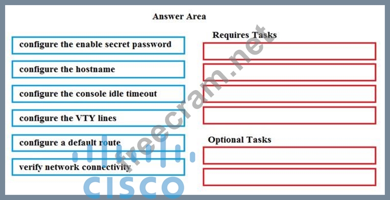 You are performing the initial configuration on a new Cisco device. Drag the task from the left onto the required or optional category on the right.