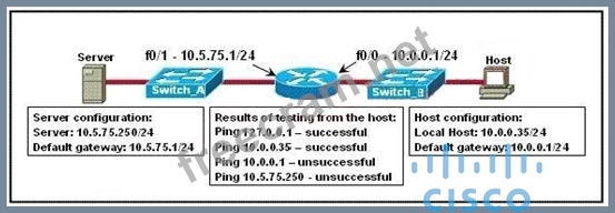 Refer to the exhibit. A technician is troubleshooting a host connectivity problem. The host is unable to ping a server connected to Switch_A. Based on the results of the testing, what could be the problem?