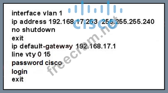 A network administrator has configured a Catalyst 2950 switch for remote management by pasting into the console the configuration commands that are shown in the exhibit. However, a Telnet session cannot be successfully established from a remote host. What should be done to fix this problem?