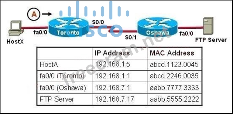 Explanation/Reference: Explanation: For packets destined to a host on another IP network, the destination MAC address will be the LAN interface of the router. Since the FTP server lies on a different network, the host will know to send the frame to its default gateway, which is Toronto.