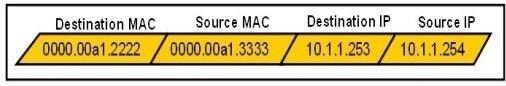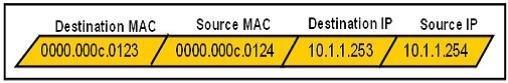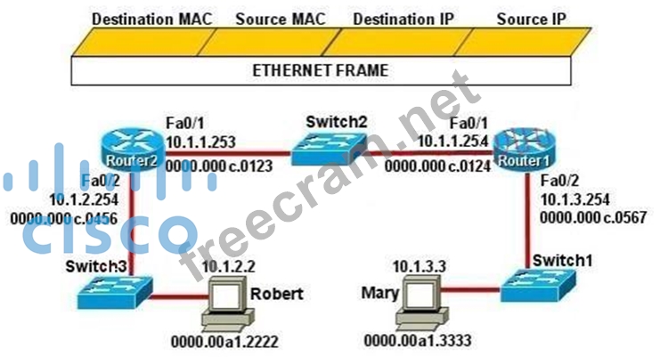Explanation/Reference: Explanation: The Source and Destination IP address is not going to change. Host 1 IP address will stay as being the source IP and the Host 2 IP address will stay the destination IP address. Those two are not going to change. For the MAC address it is going to change each time it goes from one hope to another. (Except switches... they don't change anything) Frame leaving HOST 1 is going to have a source MAC of Host 1 and a destination MAC of Router1. Router 1 is going to strip that info off and then will make the source MAC address of Router1's exiting interface, and making Router2's interface as the destination MAC address. Then the same will happen... Router2 is going to change the source/destination info to the source MAC being the Router2 interface that it is going out, and the destination will be Host2's MAC address.