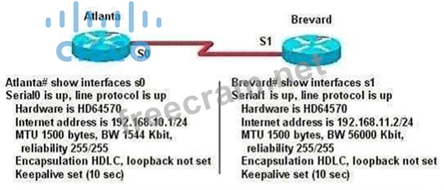 Two routers named Atlanta and Brevard are connected by their serial interfaces as shown in the exhibit, but there is no data connectivity between them. The Atlanta router is known to have a correct configuration.