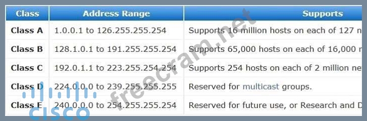 The IP address 10.6.8.35 is a Class A address. The Class A default mask is 255.0.0.0 and the range of valid addresses is 1.0.0.0 - 127.255.255.255, with the exception of the range 127.0.0.1 - 127.255.255.255, which is reserved and cannot be assigned. The IP address 192.168.5.9 is a Class C address. The Class C default mask is 255.255.255.0 and the range of valid addresses is 192.0.0.0 - 223.255.255.255. The IP address 127.0.0.1 is a Class A address, but it comes from a reserved portion that cannot be assigned.