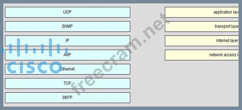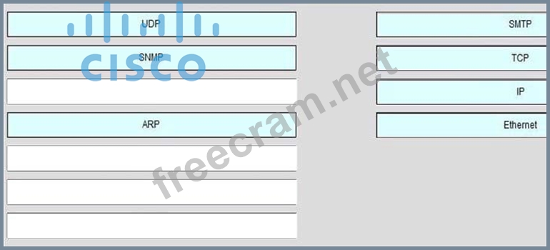 On the left are various network protocols. On the right are the layers of the TCP/IP model. Assuming a reliable connection is required, move the protocols on the left to the TCP/IP layers on the right to show the proper encapsulation for an email message sent by a host on a LAN. (Not all options are used.) Select and Place: