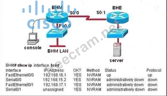 Examine the network diagram and router output shown in the exhibit. Users on the BHM LAN are unable to access the server attached to the BHE router. What two things should be done to fix this problem?