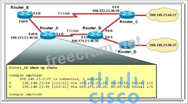 Refer to the exhibit. The network is converged.After link-state advertisements are received from Router_A, what information will Router_E contain in its routing table for the subnets 208.149.23.64 and