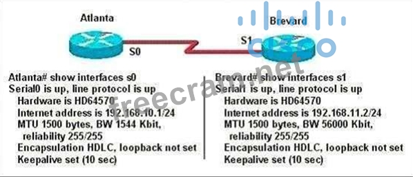 Two routers named Atlanta and Brevard are connected by their serial interfaces as shown in the exhibit, but there is no data connectivity between them. The Atlanta router is known to have a correct configuration.