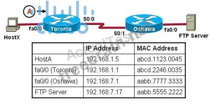 Explanation/Reference: For packets destined to a host on another IP network, the destination MAC address will be the LAN interface of the router. Since the FTP server lies on a different network, the host will know to send the frame to its default gateway, which is Toronto.