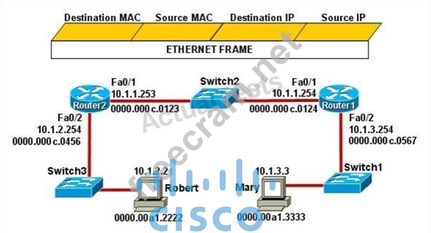 Mary is sending an instant message to Robert. The message will be broken into a series of packets that will traverse all network devices. What addresses will populate these packets as they are forwarded from Router1 to Router2?